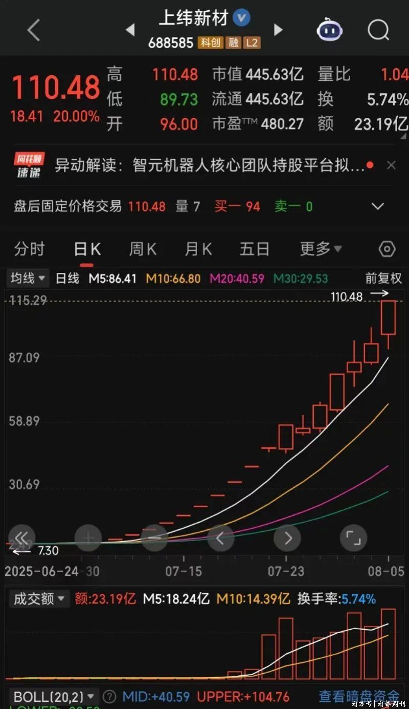 8月5日,科创板上市公司上纬新材(688585.SH)在停牌核查3个交易日后复牌,开盘后股价一路飙升至110.48元/股,单日涨幅达20%,总市值突破445.63亿元。至此,其年内累计涨幅已高达1560%,成为2025年A股首只涨幅超15倍的“妖股”。